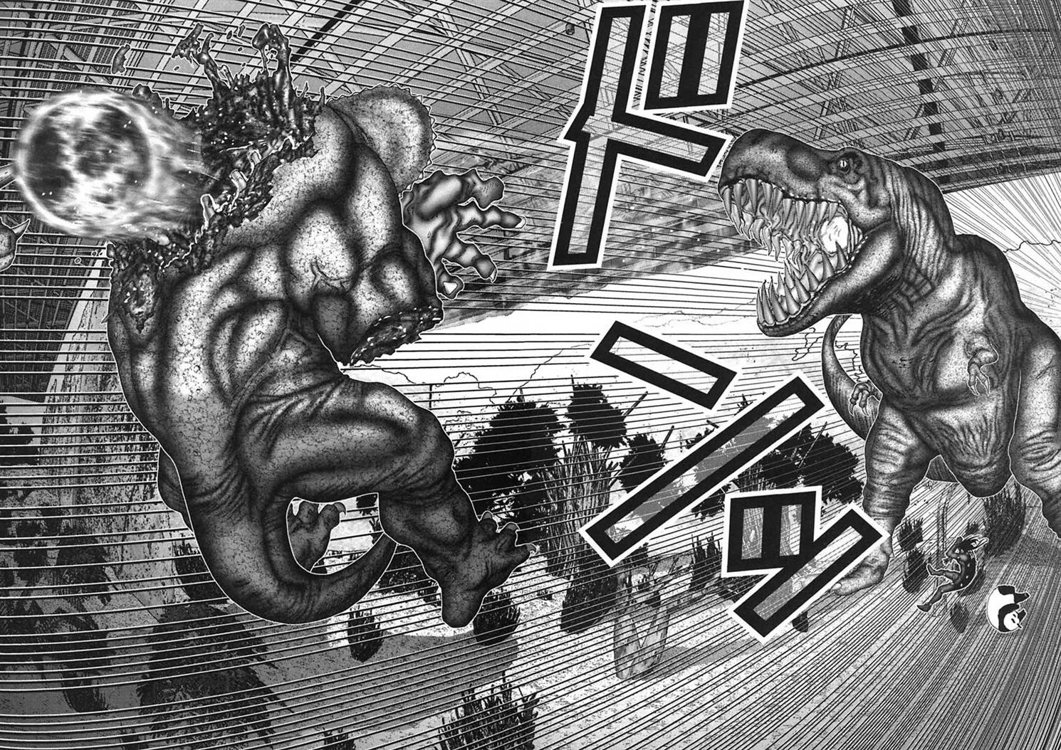 Hiroto Sakurai, Kenzo Sakata, Daizaemon Kaze, Reika Shimohira and Kouki Inaba are outside when the two come running out of the museum, while Shion stands his ground against the other T-Rex Alien. The Two Aliens pursuing Yoshikazu and Kurono soon burst out from the museum, causing everyone to run off in a panic, and the chapter ends with Kurono boarding his Gantz Bike and telling Yoshikazu to come with him.
