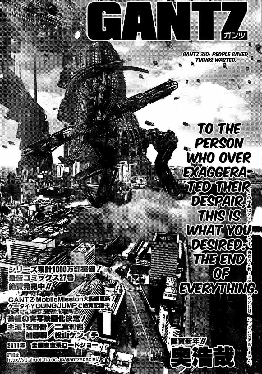 People Saved, Things Wasted (救えた者と零した物, Sukuetamono to Koboshitamono) is the 310th chapter of the Gantz manga, written and illustrated by Hiroya Oku.