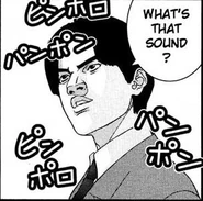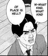 Whilst in the Gantz room he didn't do or say much. Whilst Kato was pressuring everyone to get there suits on he went up to Gantz and yanks on his face to make sure he is real. Also while Kato was talking about the suits he was praying along with Muso . When Muso talks about hell and that they may be there he is very scared and frightened. However once he is transported outside his visage changes drastically. He becomes cool and calm and insults the Gantz members.